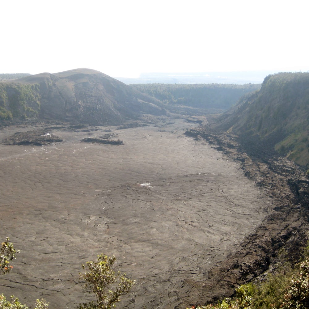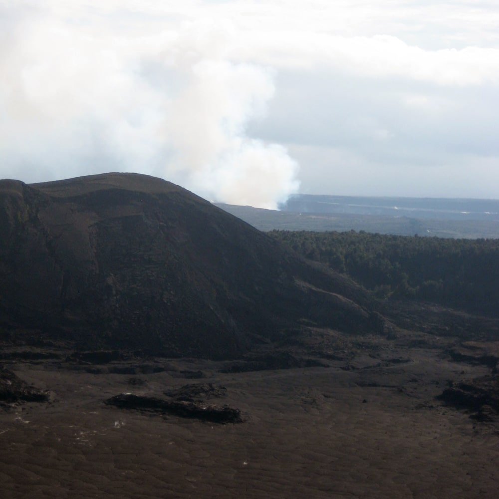 Auf der östlichen Seite angekommen fährt man immer an der Küste entlang bis zum Gebiet des Mauna Loa. Mauna heißt hier wieder Berg und Loa bedeutet „lang“. Der Berg ist tatsächlich mit 4.170 m nicht ganz so hoch wie der Mauna Kea aber seine Fläche bedeckt durch seine unglaubliche Länge einen Großteil der Insel. Vor dem Mauna Loa gibt es deinen ausgekühlten Krater. In diesen kann man runtersteigen und durchwandern. Wie gesagt durch den „kleinen“ kann man wandern… Im Hintergrund dampft, qualmt und zischt der Kilauea noch gewaltig.