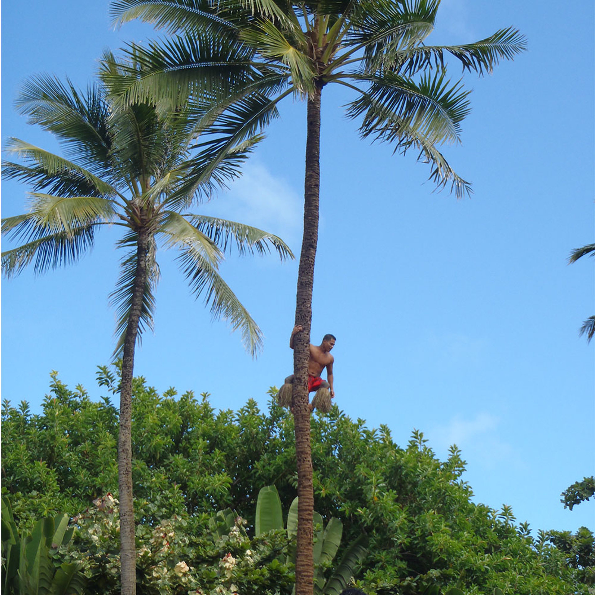Staunten über den jungen Mann der in Windeseile ohne Absicherung oder Hilfsmittel die Palme hochgeklettert ist. Und haben natürlich dann noch die Parade auf dem Wasser genossen. Hier haben wir die kämpferische Mimik der Neuseeländer gelernt.