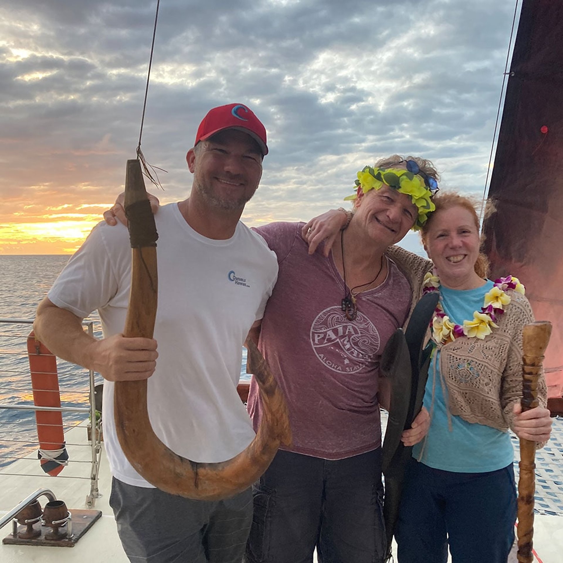 Da hat uns Danny abgeholt, der uns wieder mal mit schönen Lei begrüßt hat. Es gab viel zu erzählen und Danny hatte die gute Idee noch am selben Tag einen Sunset Sail auf dem wunderschönen Kanu eines Freundes von ihm zu buchen.