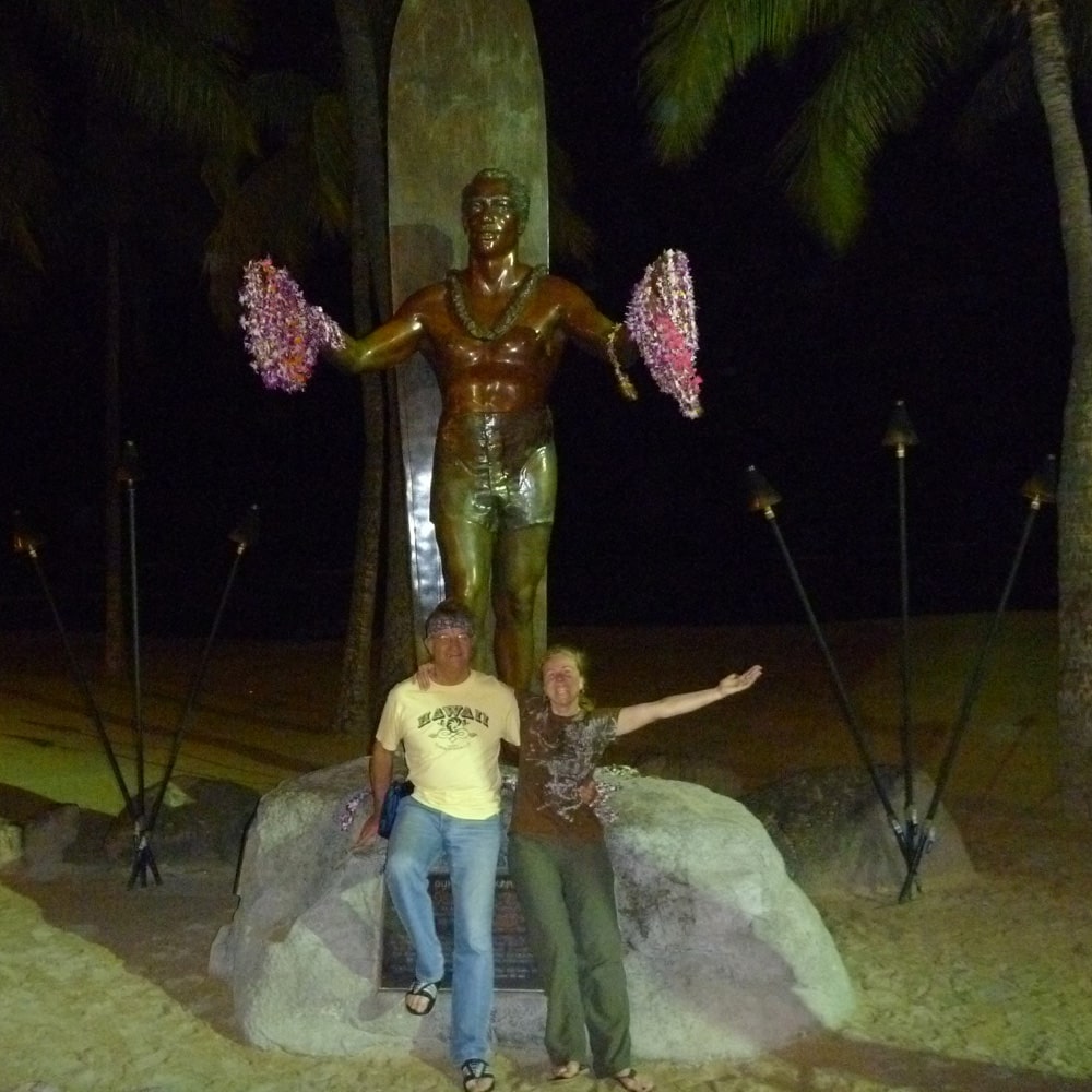 Tilo war ja bereits 2 Wochen in Dakota unterwegs und hat da sein Schulprojekt ein ganzes Stück weitergebracht. Aber davon soll er euch selber erzählen. Auf jeden Fall hat unser Treffen in Los Angeles geklappt und wir sind die zweite Strecke nach Honolulu gemeinsam geflogen. Hier nur noch schnell den Leihwagen abgeholt und dann auf ins Hotel… NEIN – nicht um endlich nach 26 Stunden völlig übermüdet ins Bett zu fallen. NEIN – um endlich den Koffer los zu werden und zu unserem mittlerweile traditionellen ersten Foto vor „dem Duke“ aufzubrechen und den ersten Mai Tai zu genießen.